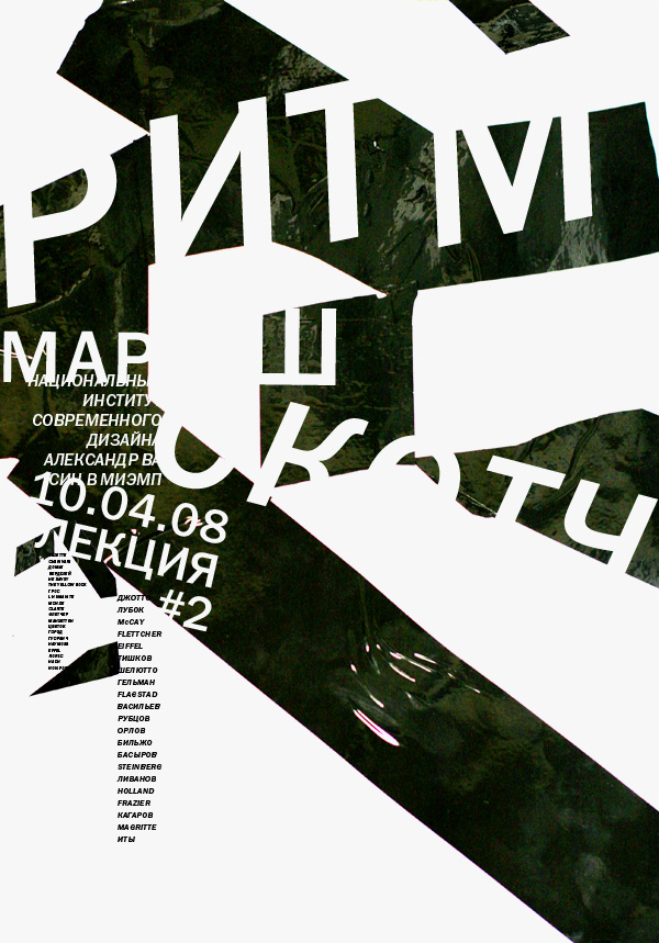 Вторая по счету лекция в Национальном институте современного дизайна (на базе Московского института экономики, менеджмента и права ) была посвящена, как ясно из заголовка, ритму, маршу и скотчу. Студентам было предложено маршировать на одну, две, три и четыре четверти, хлопать синкопами и топать голеностопами, изучать этические и эстетические свойства скотча, смотреть фрески Джотто и комиксы МакКея, а в свете проектора постигать секреты построения аксиальных, радиальных и билятеральных композиций.