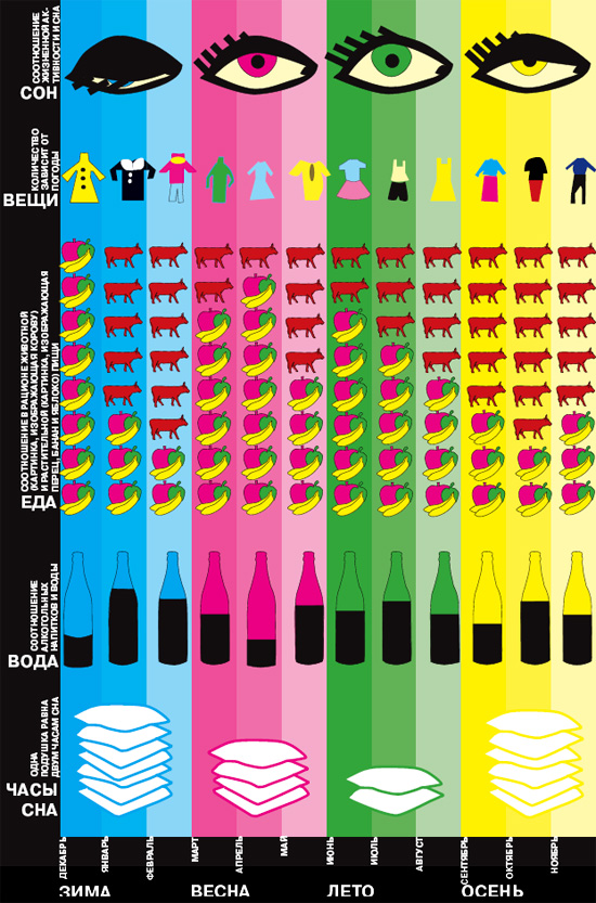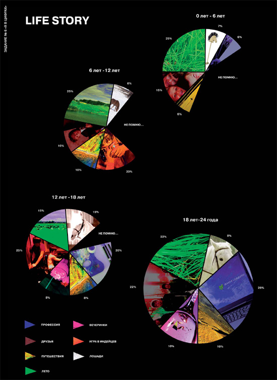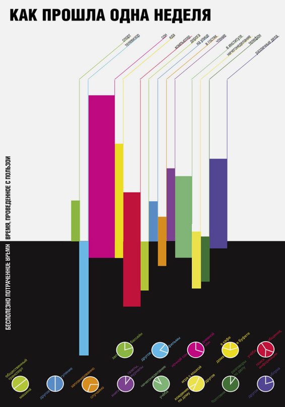 Для закрепления темы «Графики и диаграммы» каждому студенту было предложено сделать инфографический плакат про себя любимого. Габариты, интересы, работа, учеба, мысли — все может быть подвергнуто сравнению и сопоставлению. Чем оригинальнее и яснее будут диаграммы и графики, тем лучше.